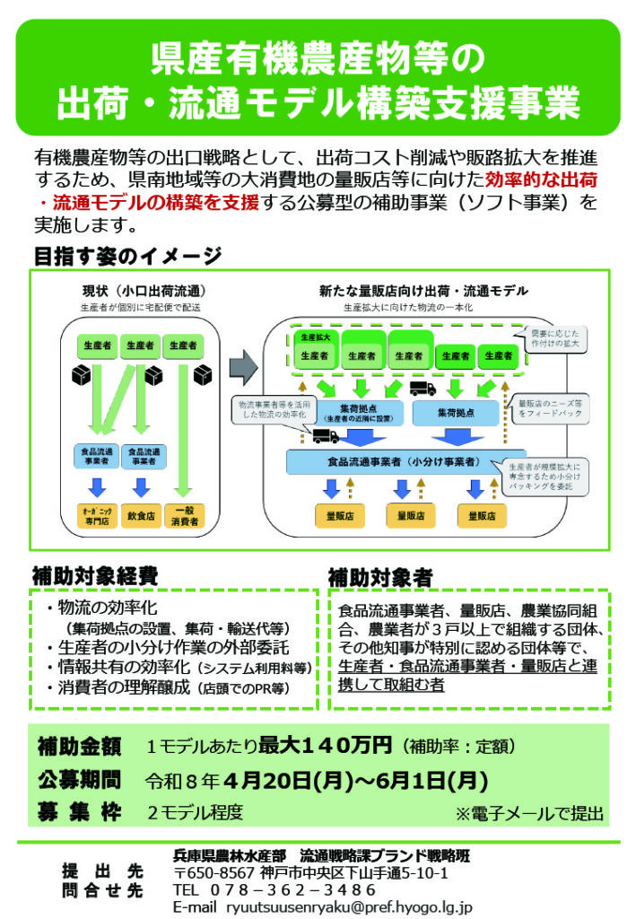令和8年度 兵庫県産有機農産物等の出荷・流通モデル構築支援事業者の募集
