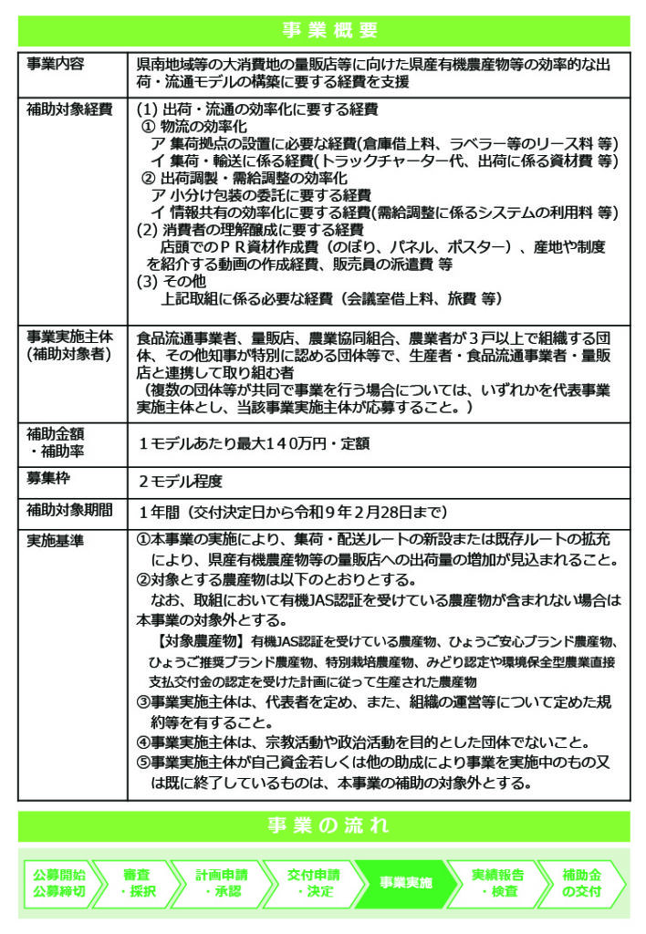 兵庫県産有機農産物等の出口戦略として、出荷にかかる労力やコストの削減、販路拡大を推進するため、県南地域等の大消費地の量販店等に向けた効率的な出荷・流通モデルの構築を支援する公募型の補助事業です。